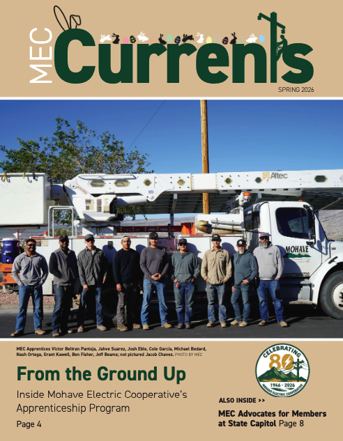 Mohave Electric Cooperative, Inc.CommunityNews & Community CommunicationsMEC CurrentsCurrents Magazine Font Size: Share Share on FacebookShare on X (Twitter)Share on PinterestShare on LinkedinShare on Email Feedback Print