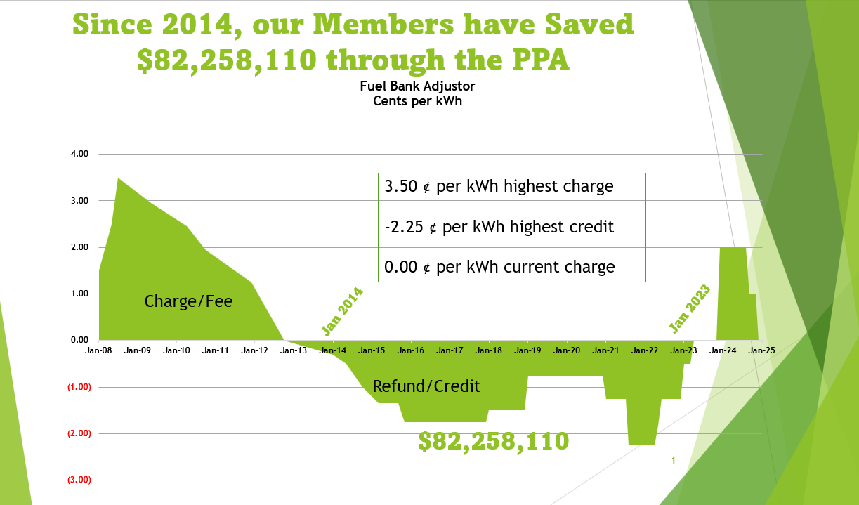 The PPA will decrease or become a credit on member bills when purchased power costs are lower than power costs already covered in approved rates. Likewise, the PPA will increase or become a charge when actual energy costs are higher than projected in current approved rates.