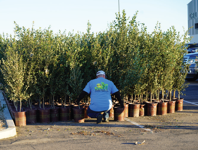 Before planting, consider how your family or business uses the outdoor space where you are thinking about placing trees. Plant at least three trees where they can provide enough shade to shield your structure and outdoor living areas. Shade the roof as well as east, west, and south-facing walls as much as possible. At maturity, the trunk and branches of the tree should have at least 15 feet of clearance from driveways, patios, sidewalks, and block walls. Most importantly, never plant trees where their growth will interfere with overhead and underground power lines.